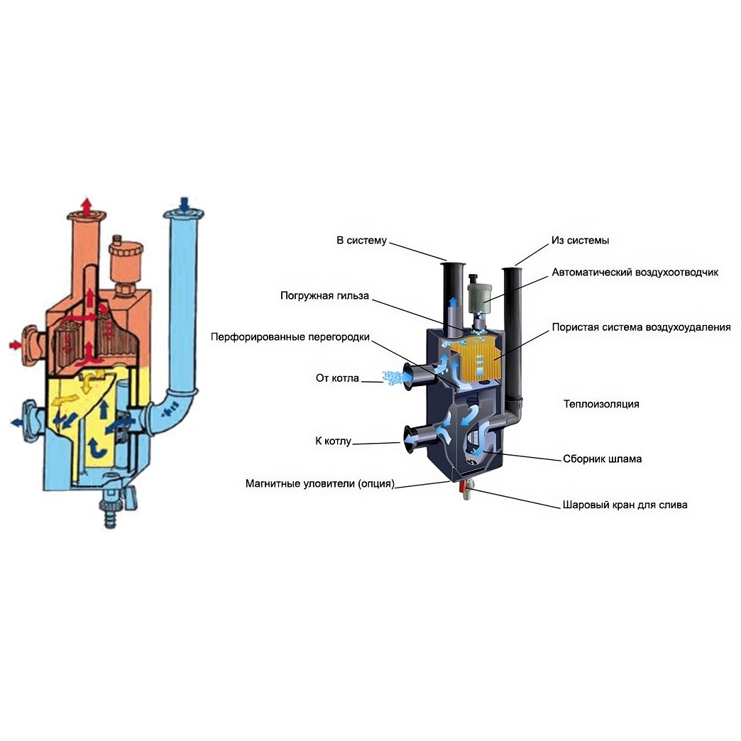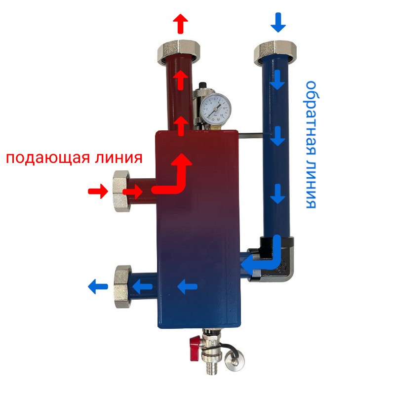 Гидравлическая стрелка помогает правильно и без перебоев работать насосам и котлам в сложных системах отопления, даже если у всех насосов разная производительность. Предотвращает воздействие насосов потребителей тепла на котловые насосы и наоборот. Позволяет чётко организовать работу многокотельной установки, помогает котлам выходить на максимальную