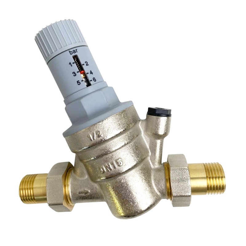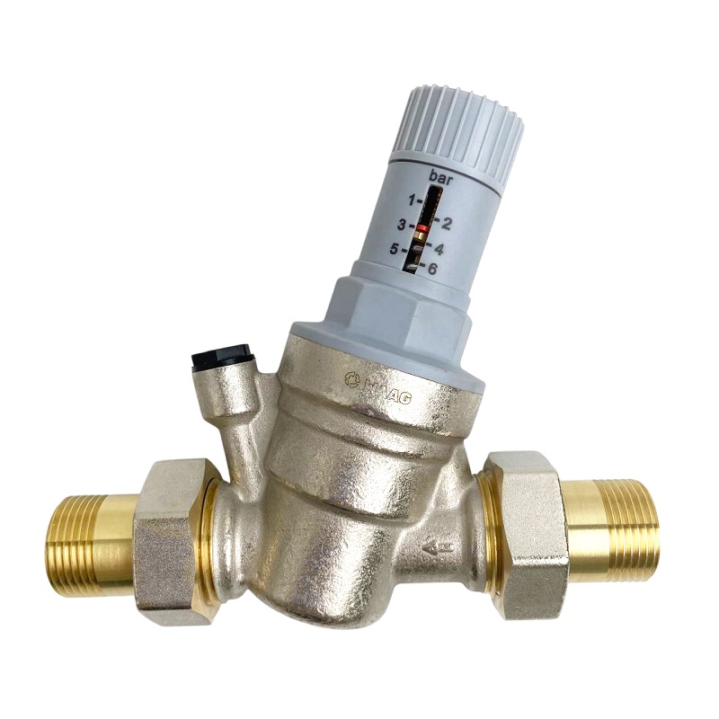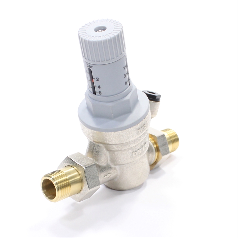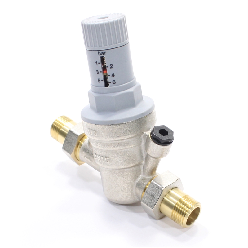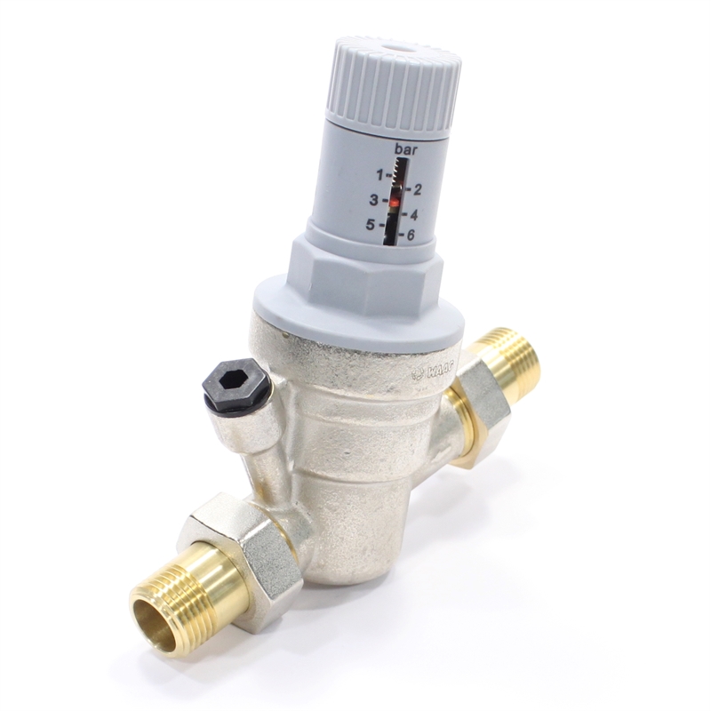 Патентованный редукционный мембранный клапан с оптимизированным седлом, регулятором выходного давления и шкалой для визуального контроля выходного давления. В комплекте с разъемными резьбовыми соединениями. Корпус и колпачок из латуни. Встроенный фильтр грубой очистки (сеточка из нержавеющей стали). Пластмассовое седло клапана. Макс. давление на входе 25 бар. Диапазон регулирования давления на выходе от 1,5 до 6 бар. Может использоваться для воды, воздуха и нейтральных газов с температурой до 30 °C. Уровень шума менее 20 дБ.