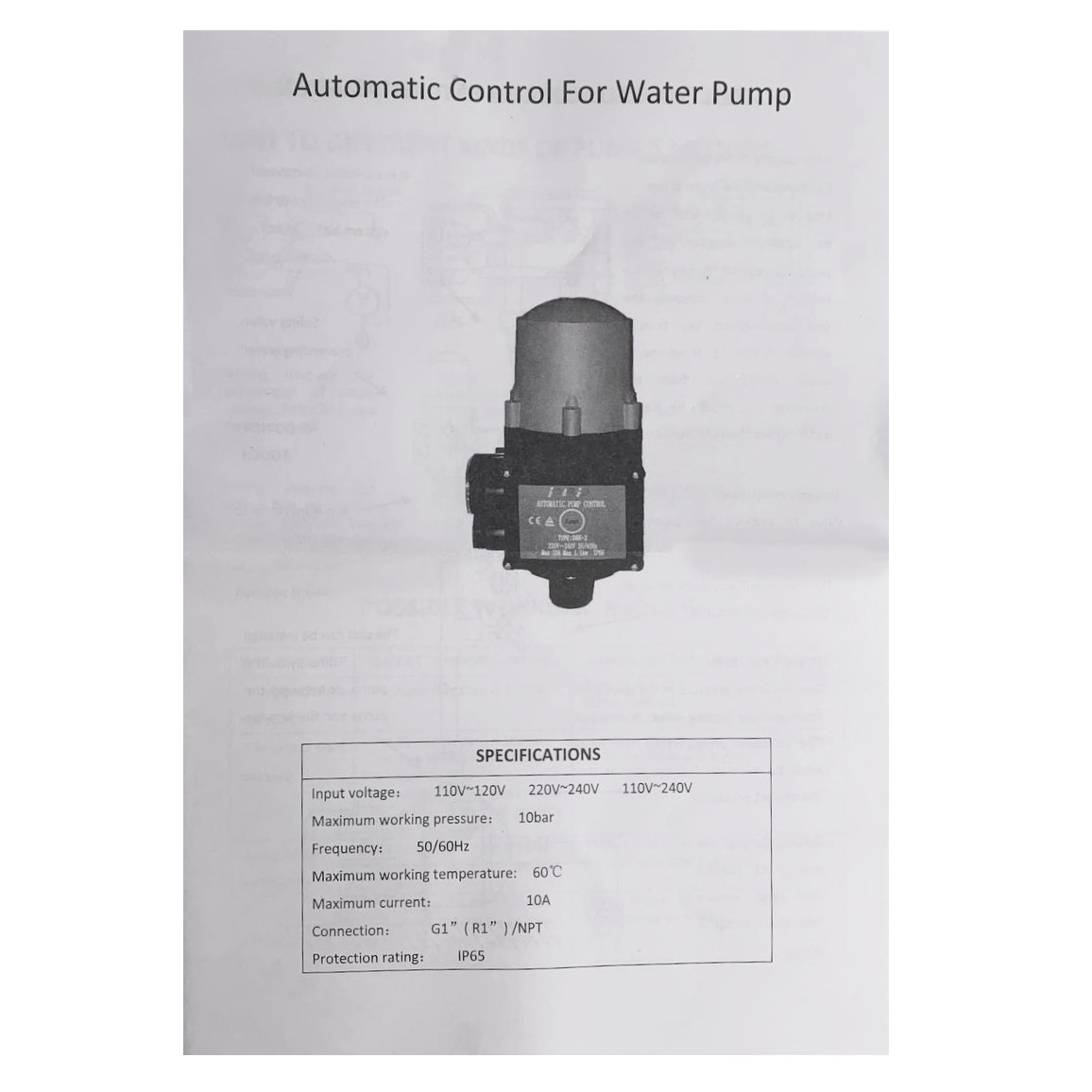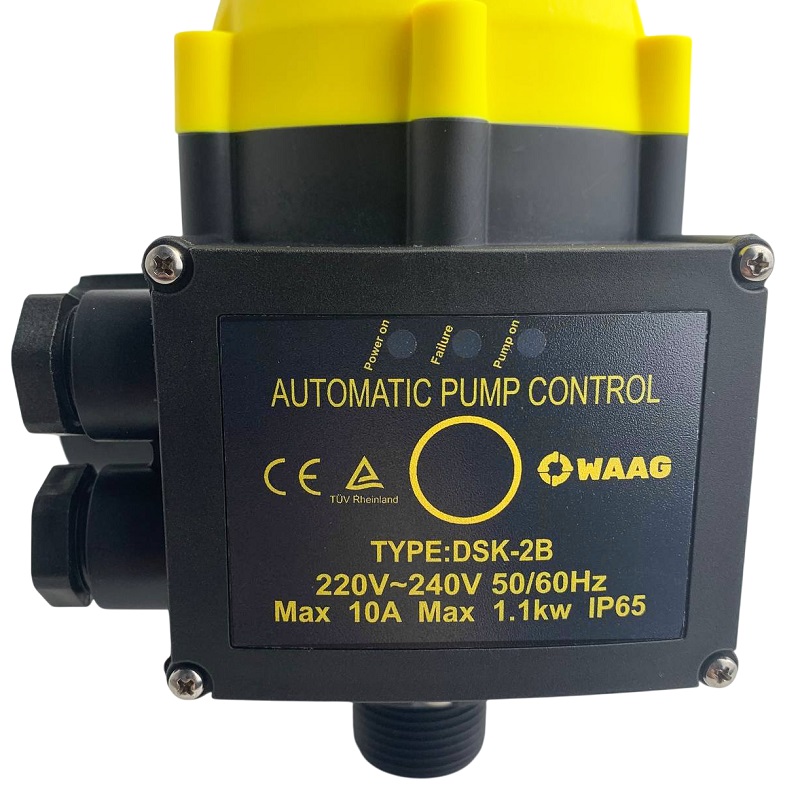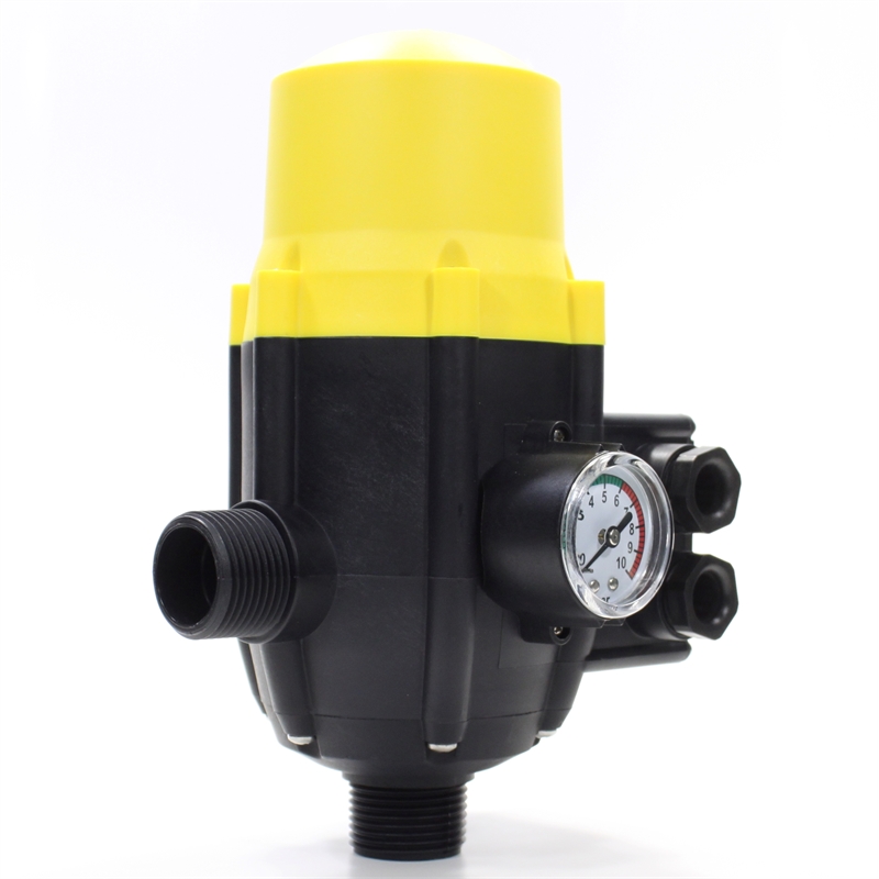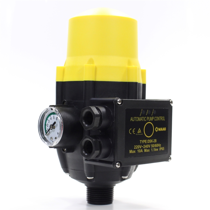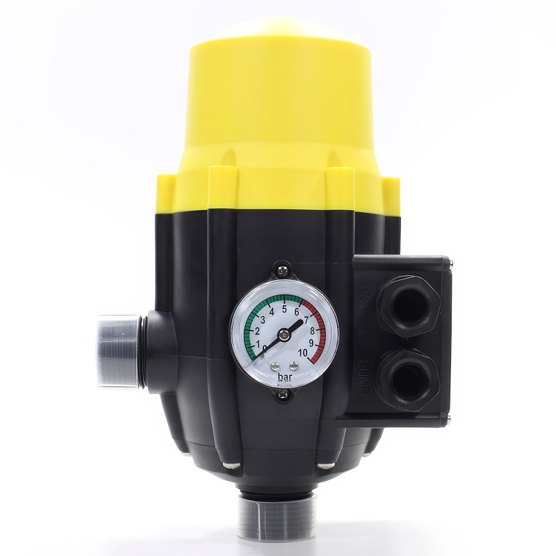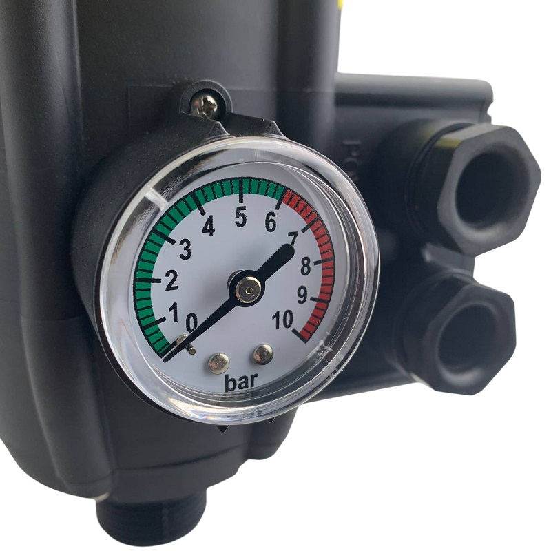 Блок автоматики осуществляет регулирование работы насоса по потоку и давлению. Блок автоматики снабжен манометром, монтируется в напорном трубопроводе или на выходе насоса.