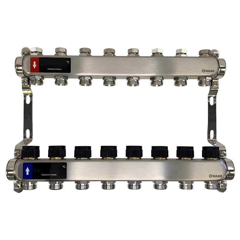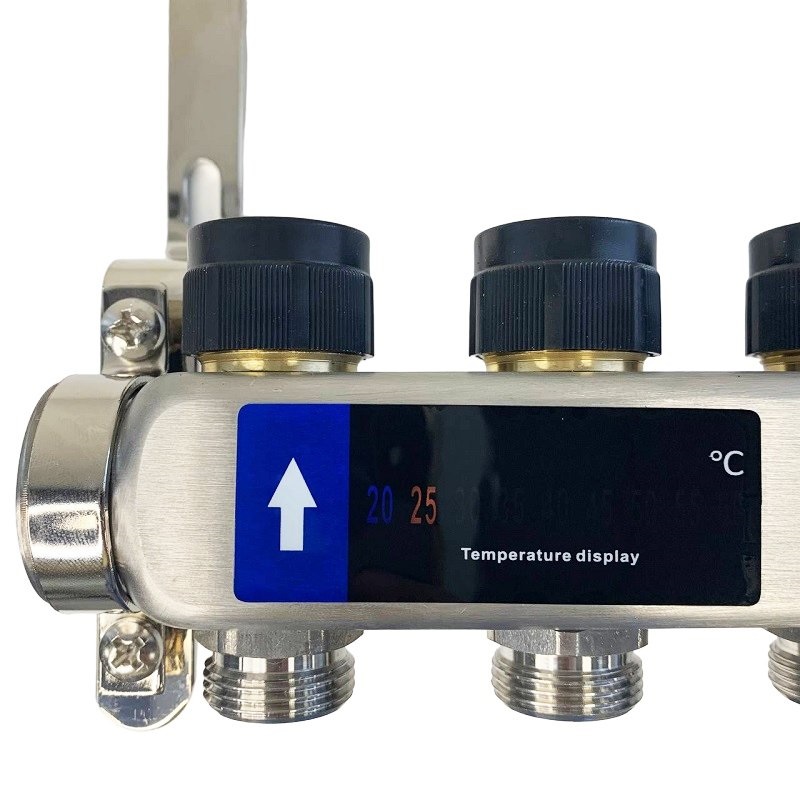 Коллекторный блок из нержавеющей стали служит для распределения потоков по контурам теплого пола, радиаторного отопления, прочих климатических систем, где в качестве теплоносителя используется вода либо незамерзающие растворы гликоля с максимальной рабочей температурой 90 °С, рабочим давлением до 9 бар.