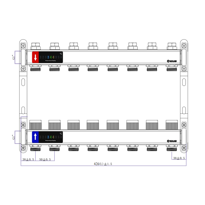 Выходы обратного коллектора блока оборудованы регулировочными клапанами с возможностью установки электротермических сервоприводов, подающего – настроечными микрометрическими клапанами.