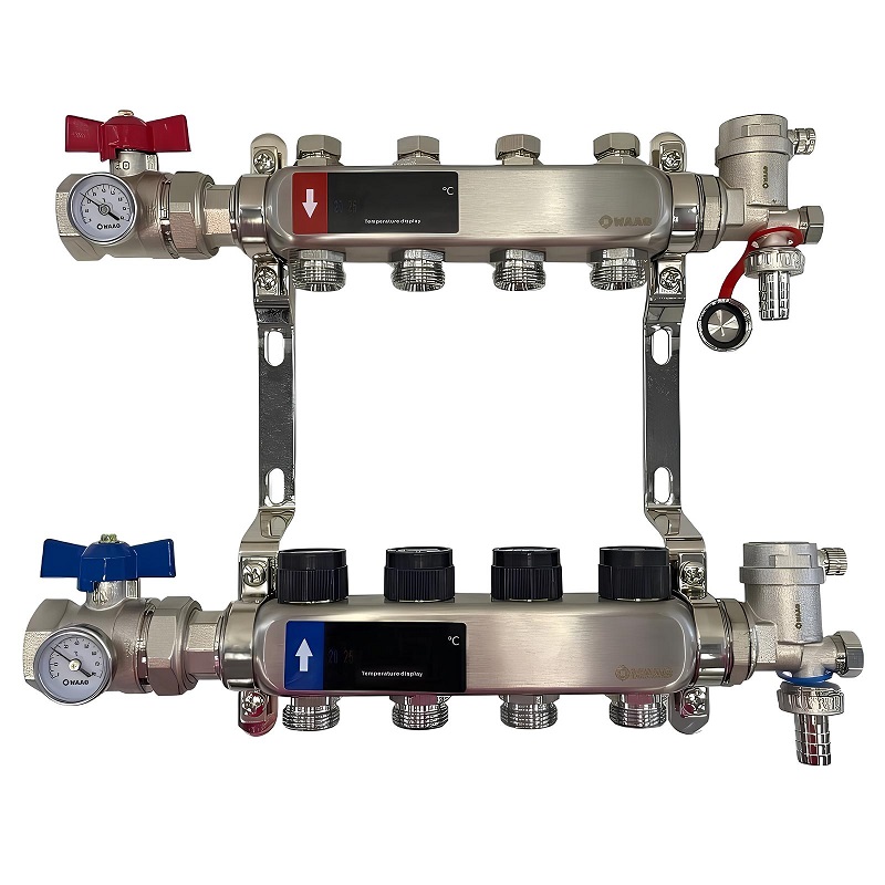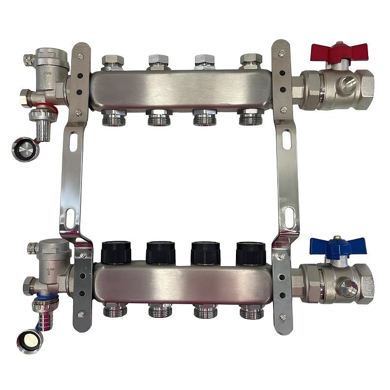 Коллекторный блок из нержавеющей стали служит для распределения потоков по контурам теплого пола, радиаторного отопления, прочих климатических систем, где в качестве теплоносителя используется вода либо незамерзающие растворы гликоля с максимальной рабочей температурой 90 °С, рабочим давлением до 9 бар.