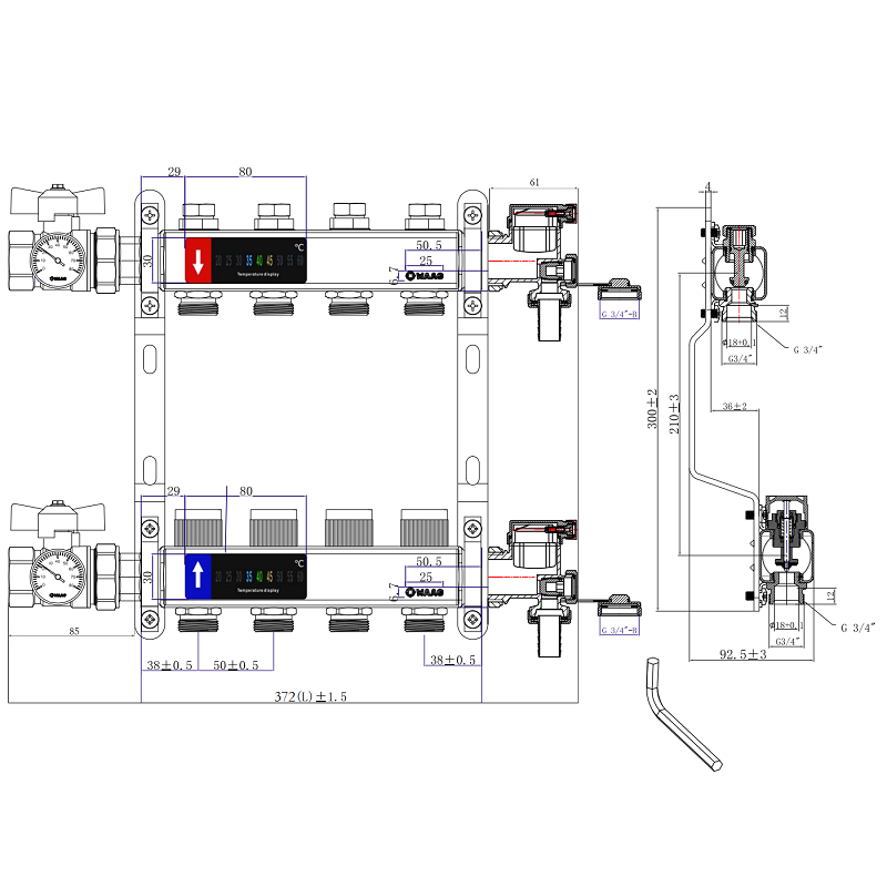 Выходы обратного коллектора блока оборудованы регулировочными клапанами с возможностью установки электротермических сервоприводов, подающего – настроечными микрометрическими клапанами.