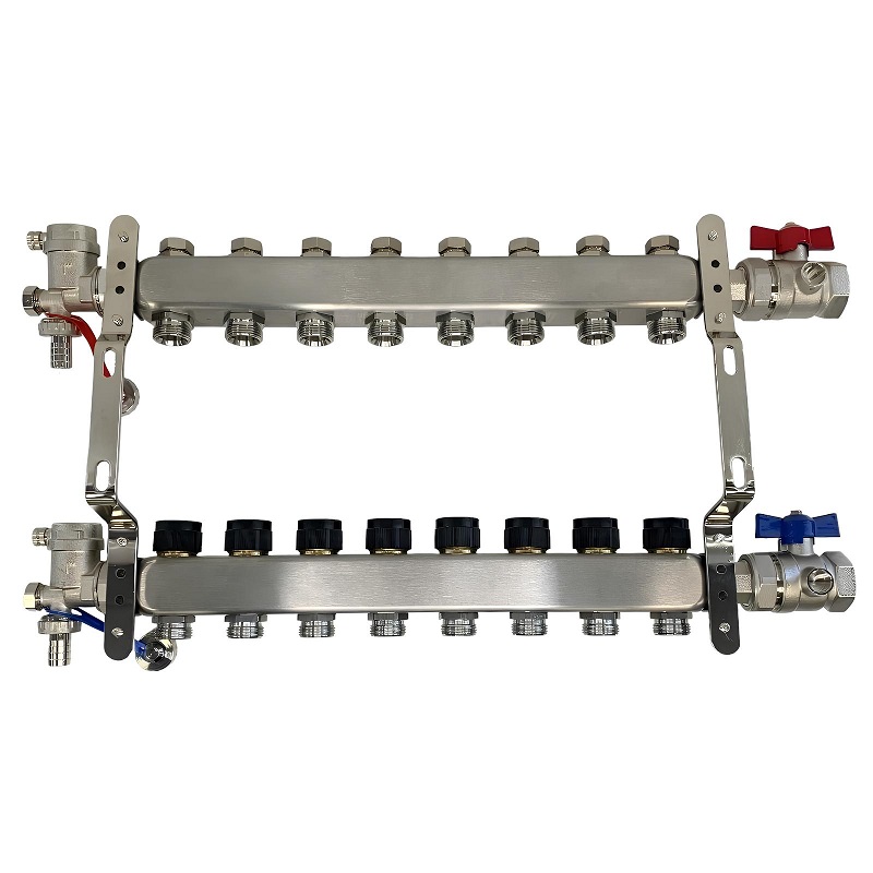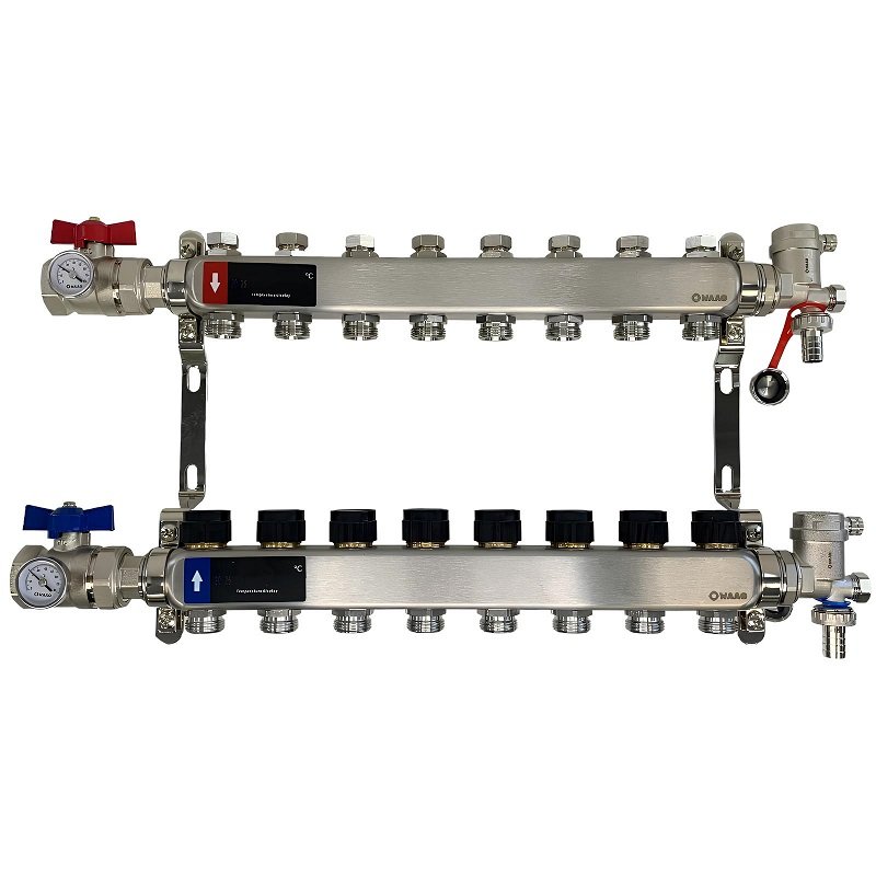 Коллекторный блок из нержавеющей стали служит для распределения потоков по контурам теплого пола, радиаторного отопления, прочих климатических систем, где в качестве теплоносителя используется вода либо незамерзающие растворы гликоля с максимальной рабочей температурой 90 °С, рабочим давлением до 9 бар.