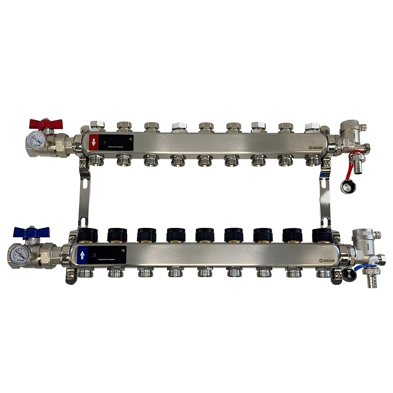 Коллекторный блок из нержавеющей стали служит для распределения потоков по контурам теплого пола, радиаторного отопления, прочих климатических систем, где в качестве теплоносителя используется вода либо незамерзающие растворы гликоля с максимальной рабочей температурой 90 °С, рабочим давлением до 9 бар.