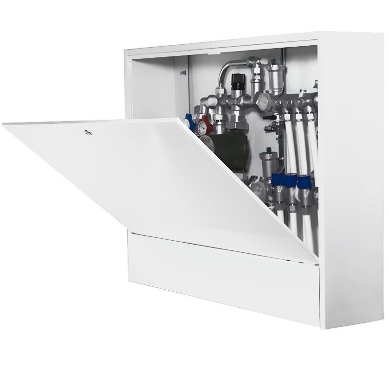 - Большая глубина шкафа позволяет устанавливать габаритные узлы учета, насосы и другую арматуру.