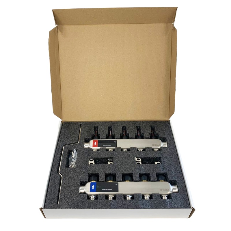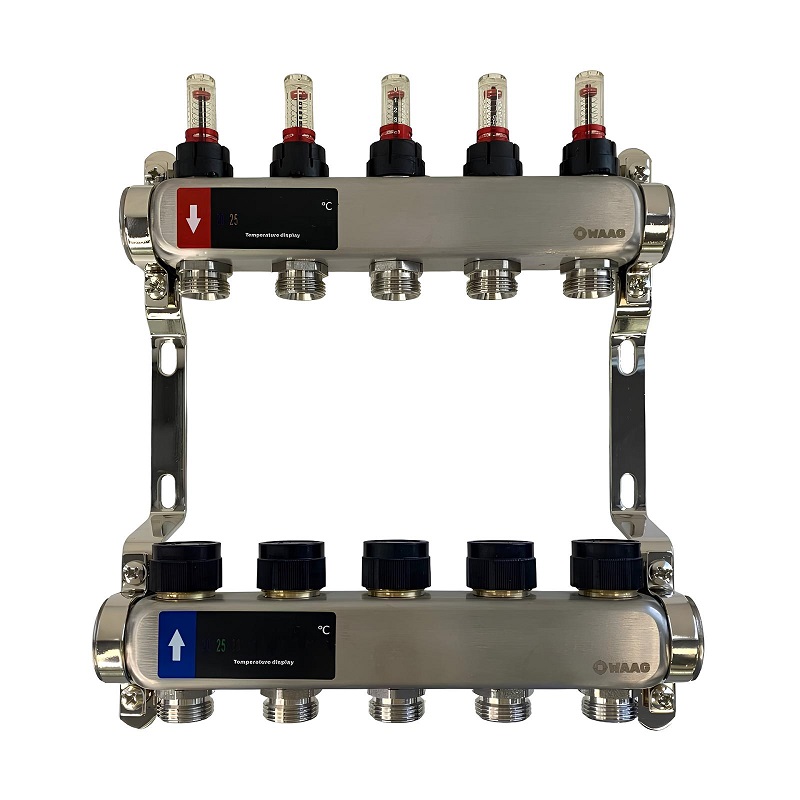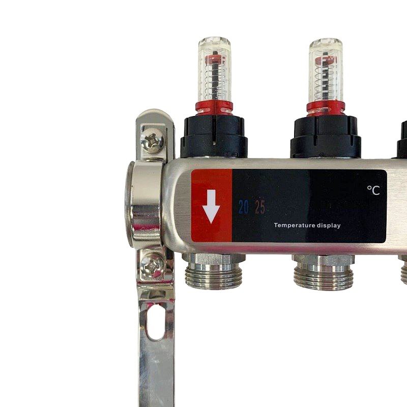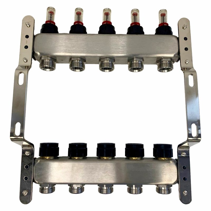 Коллекторный блок из нержавеющей стали служит для распределения потоков по контурам теплого пола, радиаторного отопления, прочих климатических систем, где в качестве теплоносителя используется вода либо незамерзающие растворы гликоля с максимальной рабочей температурой 90 °С, рабочим давлением до 9 бар.