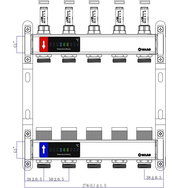 Выходы обратного коллектора блока оборудованы регулировочными клапанами с возможностью установки электротермических сервоприводов, подающего – настроечными клапанами с расходомерами (ротаметрами).