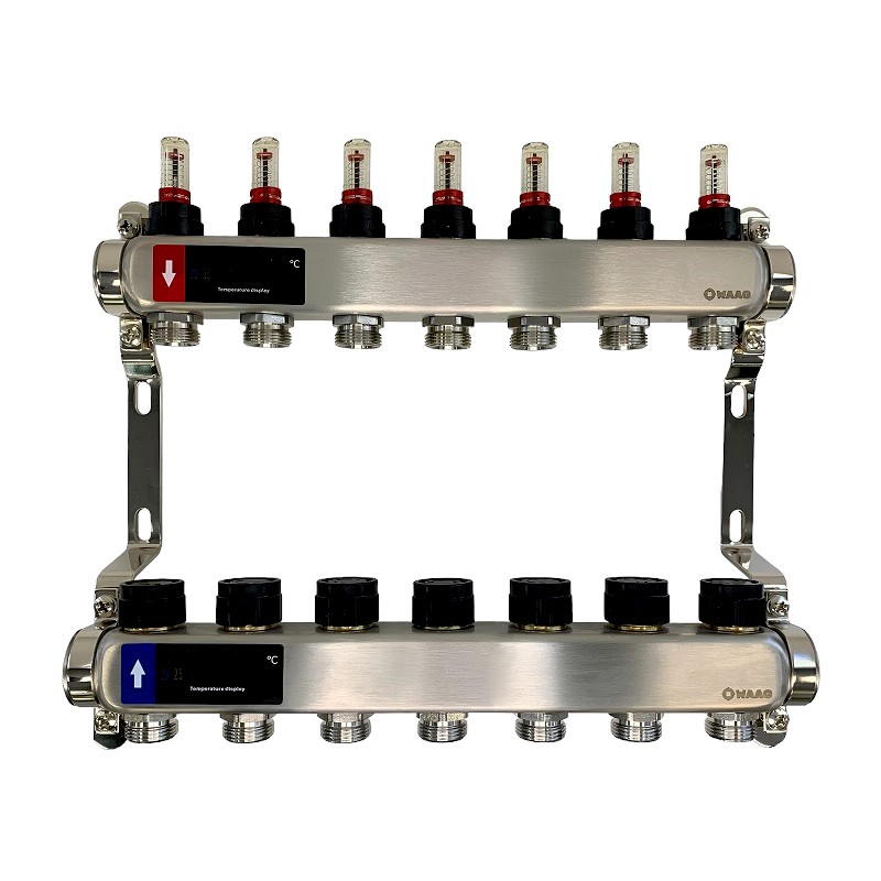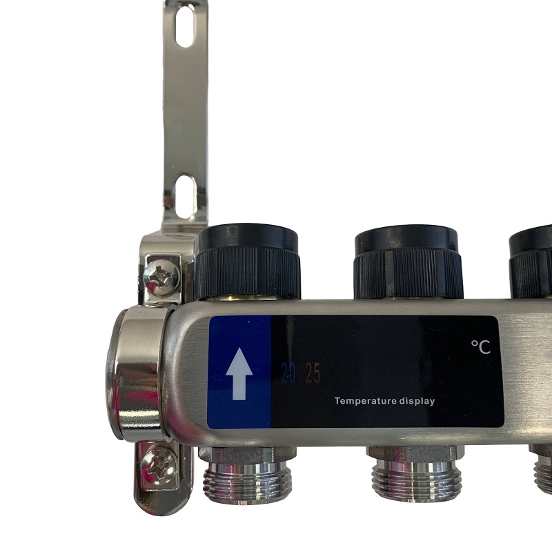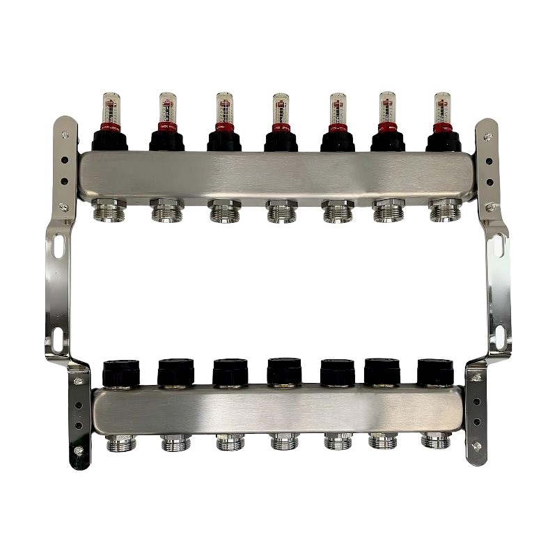 Коллекторный блок из нержавеющей стали служит для распределения потоков по контурам теплого пола, радиаторного отопления, прочих климатических систем, где в качестве теплоносителя используется вода либо незамерзающие растворы гликоля с максимальной рабочей температурой 90 °С, рабочим давлением до 9 бар.