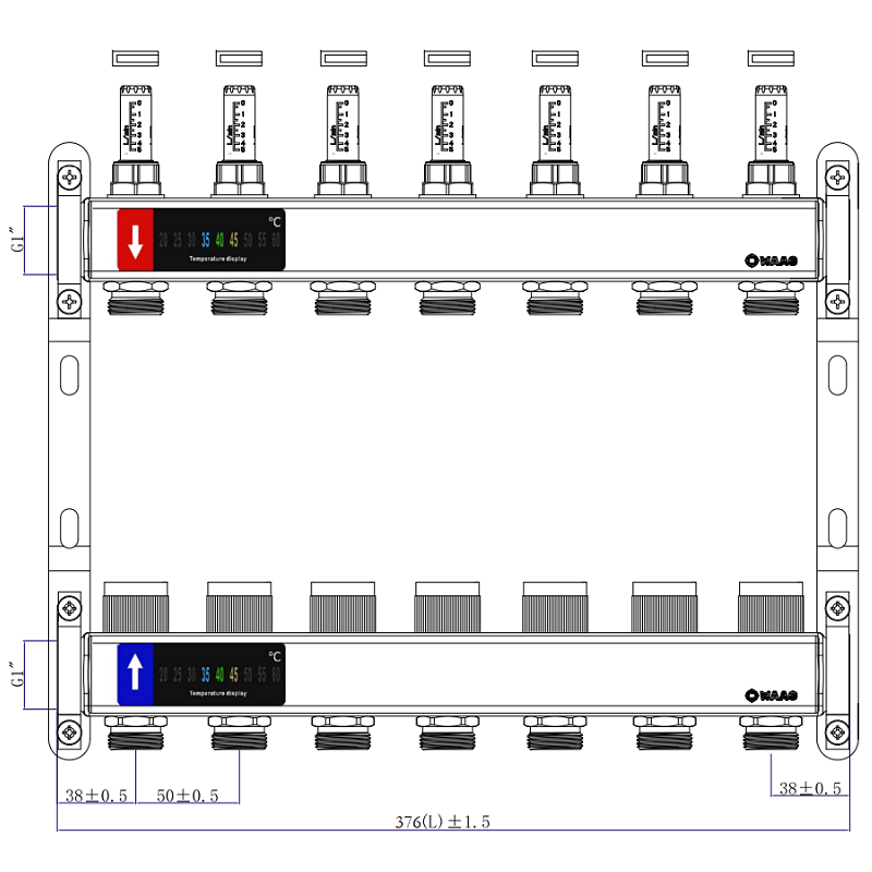 Коллектор WAAG 589 1"х3/4", 7вых., c клапанами, с расходомерами, сталь нерж.