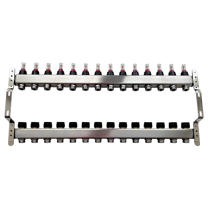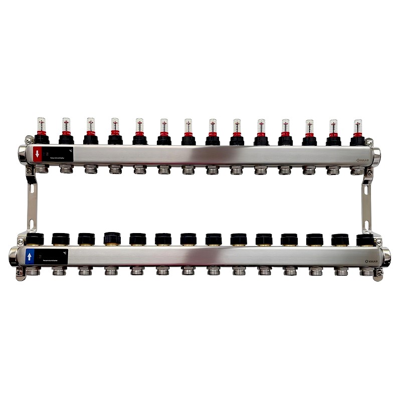 Коллекторный блок из нержавеющей стали служит для распределения потоков по контурам теплого пола, радиаторного отопления, прочих климатических систем, где в качестве теплоносителя используется вода либо незамерзающие растворы гликоля с максимальной рабочей температурой 90 °С, рабочим давлением до 9 бар.