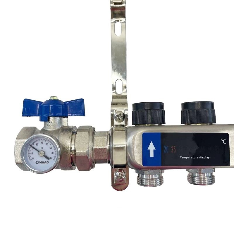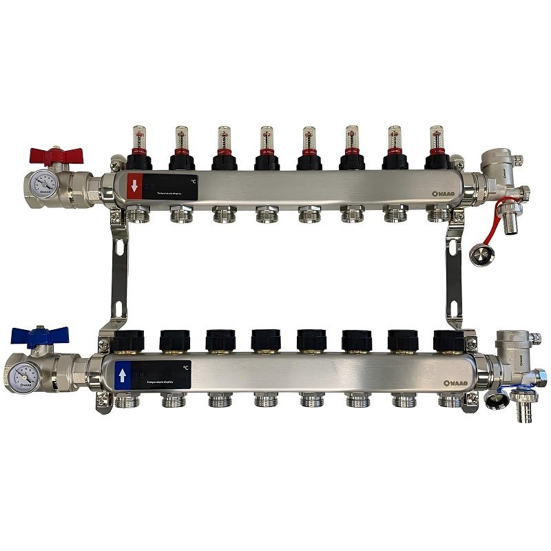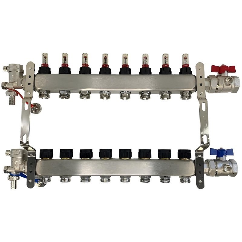 Коллекторный блок из нержавеющей стали служит для распределения потоков по контурам теплого пола, радиаторного отопления, прочих климатических систем, где в качестве теплоносителя используется вода либо незамерзающие растворы гликоля с максимальной рабочей температурой 90 °С, рабочим давлением до 9 бар.
