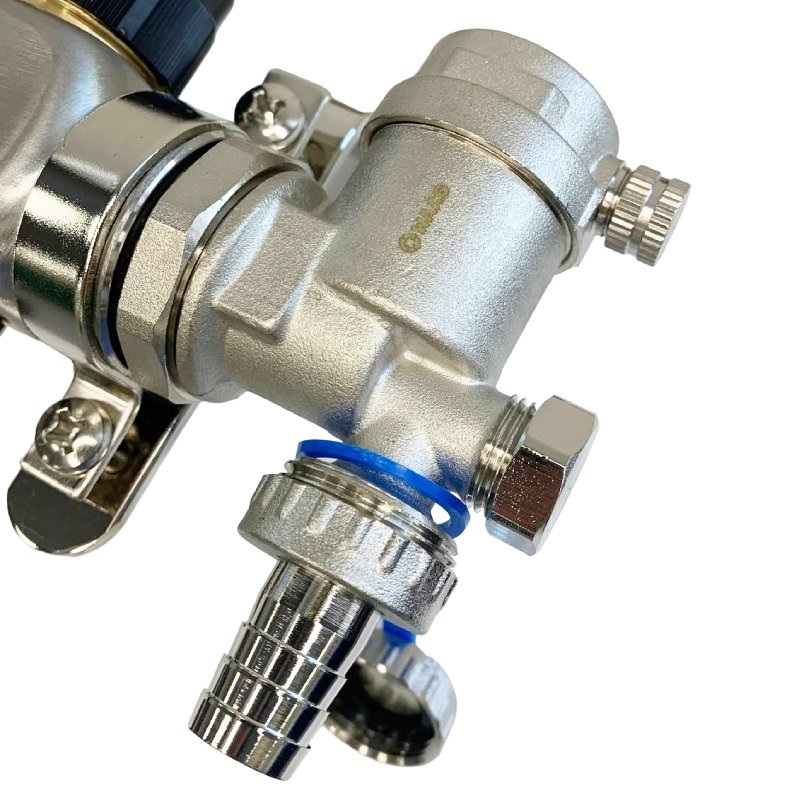 Выходы обратного коллектора блока оборудованы регулировочными клапанами с возможностью установки электротермических сервоприводов, подающего – настроечными клапанами с расходомерами (ротаметрами).