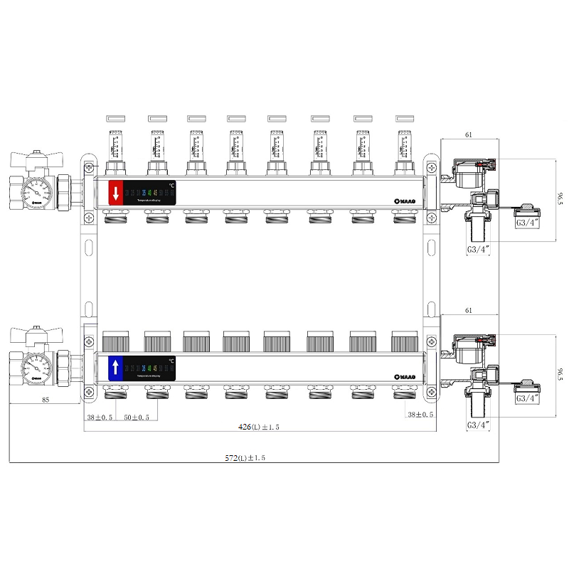 Условный диаметр коллекторов – 1". Резьба выходов – наружная, 3/4".
