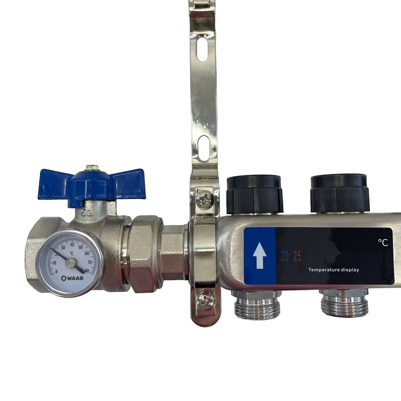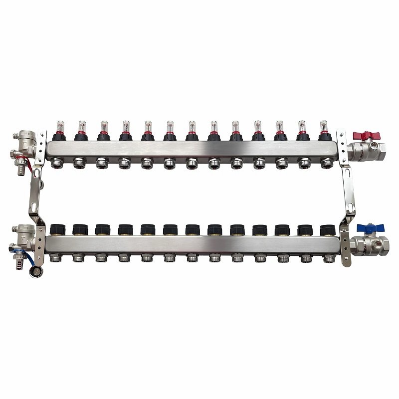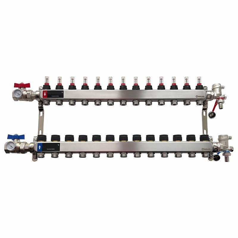 Коллекторный блок из нержавеющей стали служит для распределения потоков по контурам теплого пола, радиаторного отопления, прочих климатических систем, где в качестве теплоносителя используется вода либо незамерзающие растворы гликоля с максимальной рабочей температурой 90 °С, рабочим давлением до 9 бар.