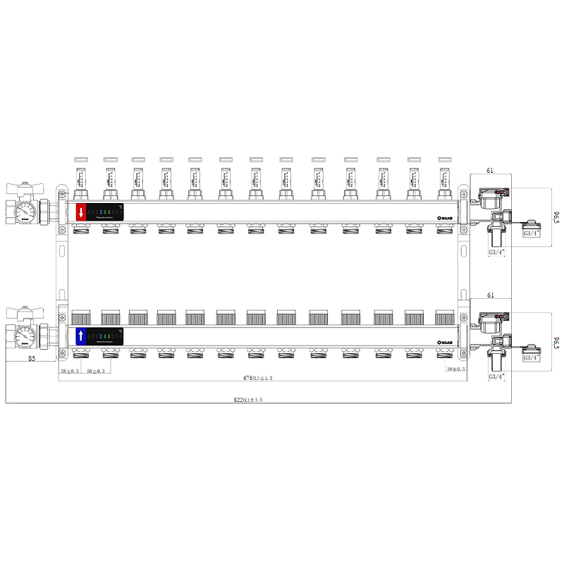 Выходы обратного коллектора блока оборудованы регулировочными клапанами с возможностью установки электротермических сервоприводов, подающего – настроечными клапанами с расходомерами (ротаметрами).