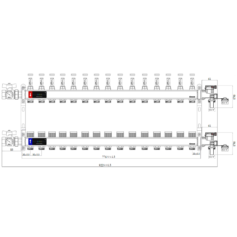 Выходы обратного коллектора блока оборудованы регулировочными клапанами с возможностью установки электротермических сервоприводов, подающего – настроечными клапанами с расходомерами (ротаметрами).