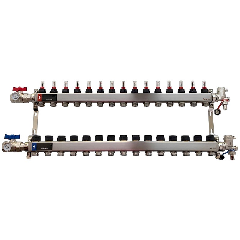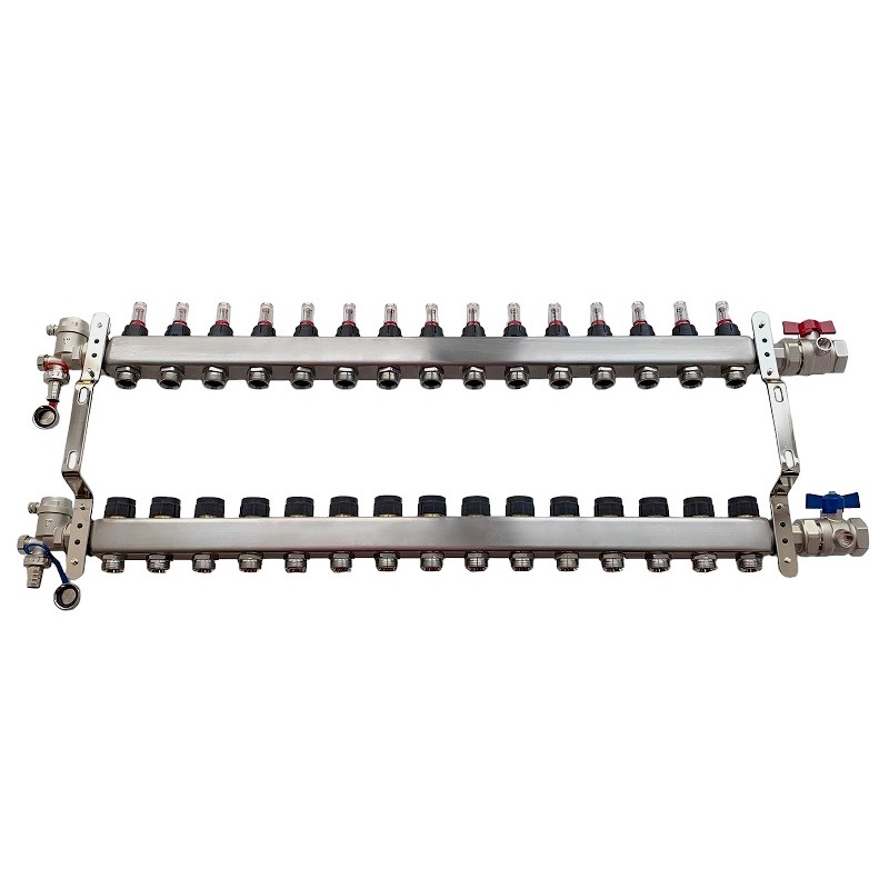 Коллекторный блок из нержавеющей стали служит для распределения потоков по контурам теплого пола, радиаторного отопления, прочих климатических систем, где в качестве теплоносителя используется вода либо незамерзающие растворы гликоля с максимальной рабочей температурой 90 °С, рабочим давлением до 9 бар.
