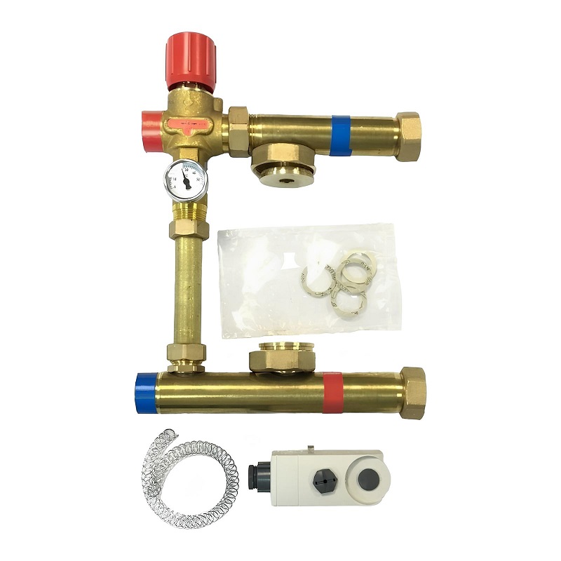 Готовый к монтажу, компактный регулирующий модуль для систем напольного отопления тепловой мощностью до 15 кВт. Поставляется без насоса, с ограничителем температуры. Накидные гайки с плоским уплотнением для монтажа с обеих сторон на 1" коллекторных патрубков.