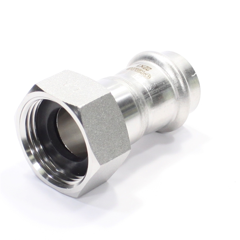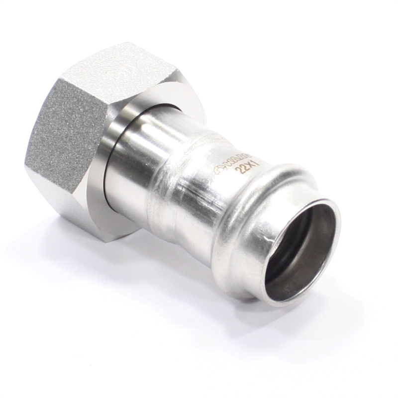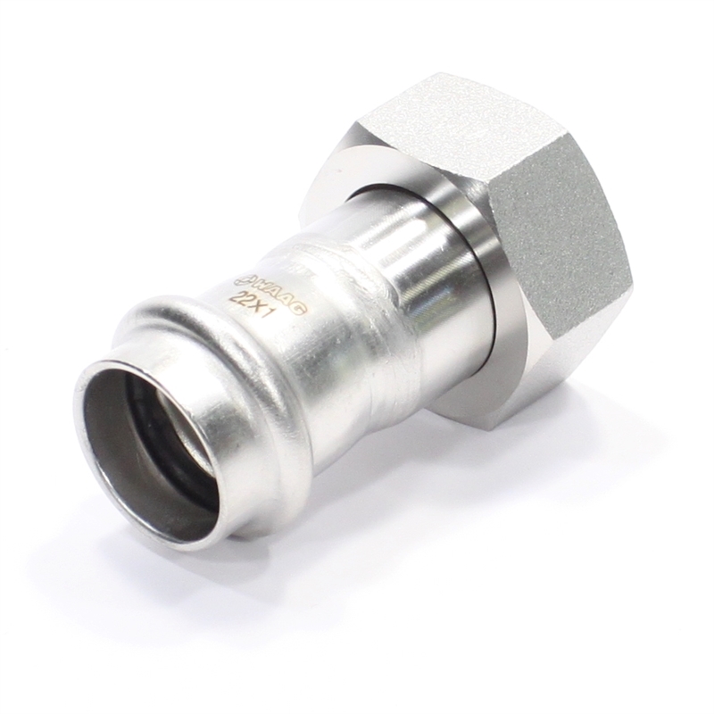 Пресс-фитинг из нержавеющей стали с накидной гайкой обеспечивает соединение тонкостенной стальной трубы c элементом системы, имеющим наружную резьбу. Область применения – трубопроводы водоснабжения, отопления, иные инженерные и технологические установки с рабочей температурой до 120 °С и давлением до 16 бар.