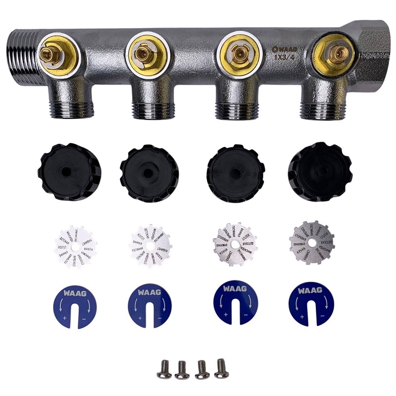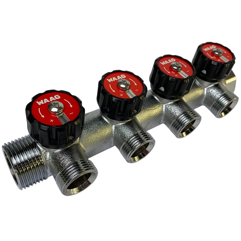 Коллектор WAAG 323 1"х3/4", 4вых., c вентилями, латунь никелир.