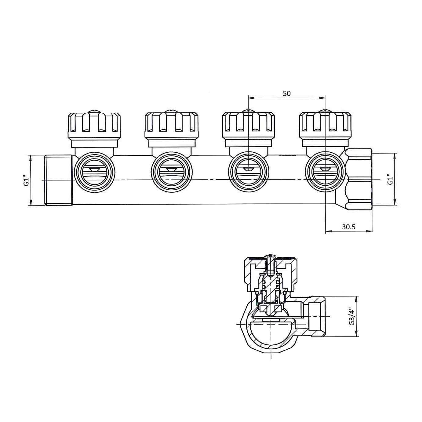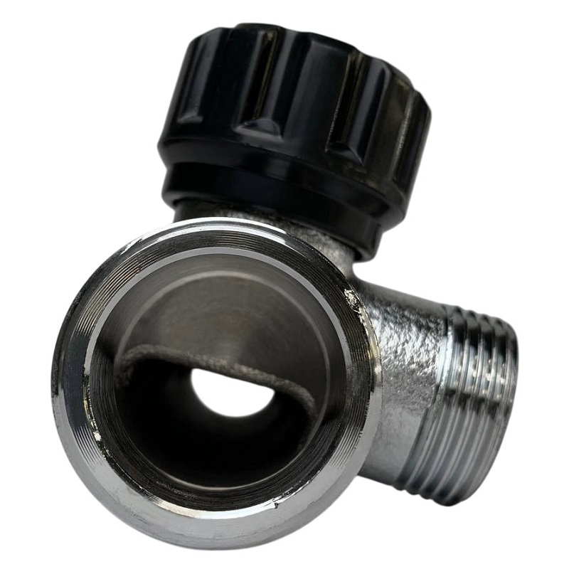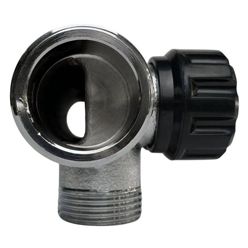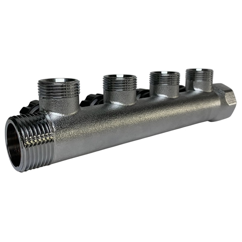 Латунный никелированный коллектор на 2 выхода диаметром 3/4" с наружной резьбой, стандарт присоединения - «евроконус». На каждом выходе предусмотрен вентиль для регулирования расхода рабочей среды.