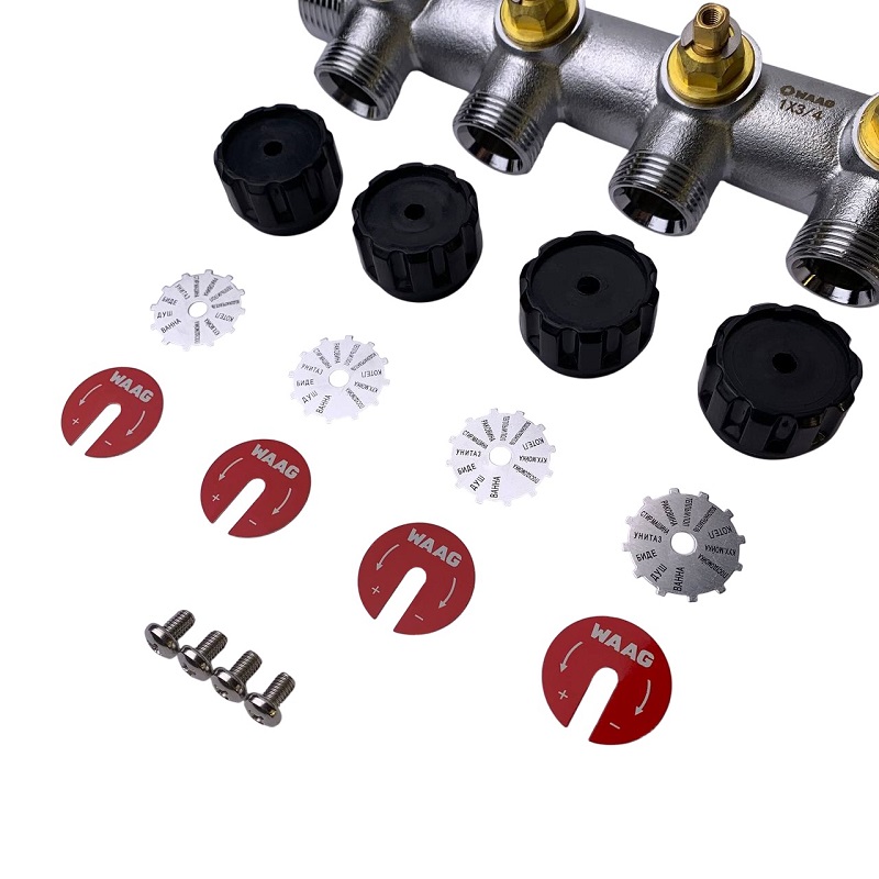 Применяется для распределения потоков жидкостей в контурах теплого пола, радиаторного отопления, холодного и горячего водоснабжения. Комплектуется набором ручек вентилей красного и синего цвета.