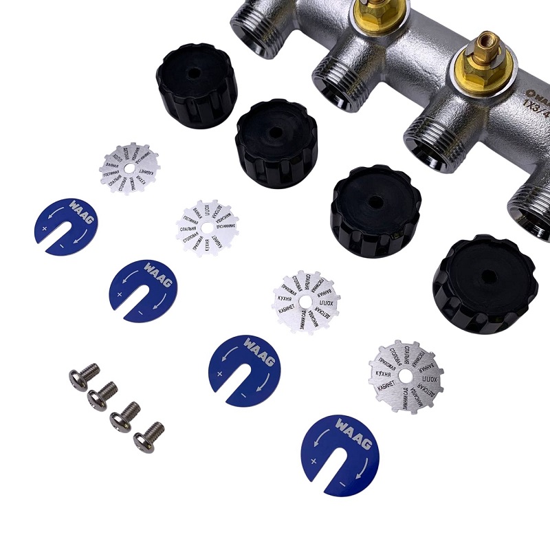 2. Регулирующие ручки коллекторов снабжены двумя вкладышами-дисками: один двусторонний сине-красный, благодаря чему Вы можете установить коллектор как на холодную, так и на горячую воду, повернув диск нужным цветом или в систему отопления для обозначения подающей / отводящей магистрали.