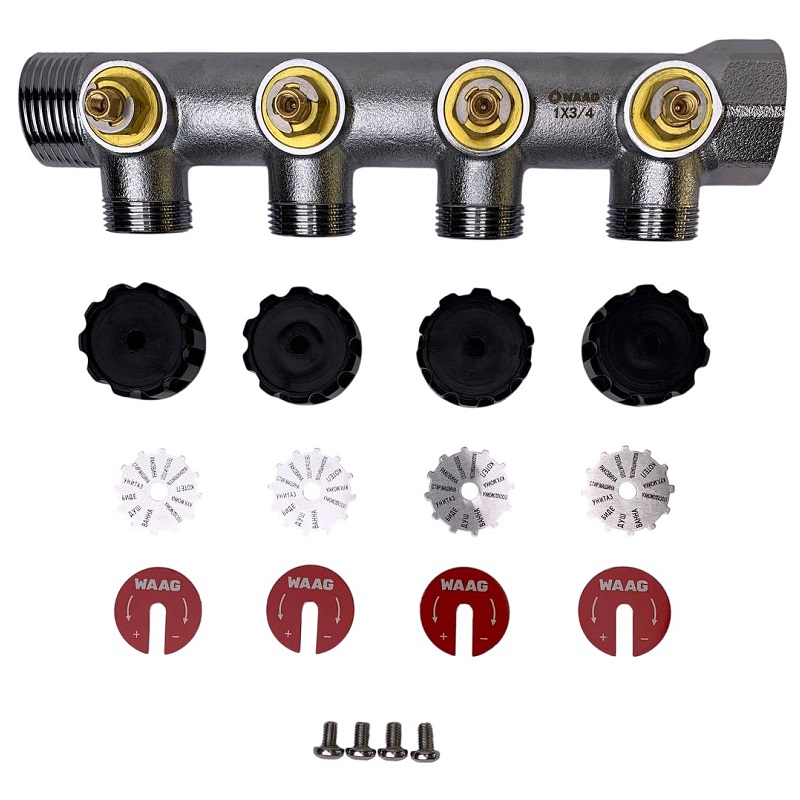 Коллектор со встроенными регулировочными вентилями распределяет рабочую жидкость по потребителям, а также имеет возможность отключения каждого из них и позволяет регулировать расход воды для каждого потребителя в отдельности.
